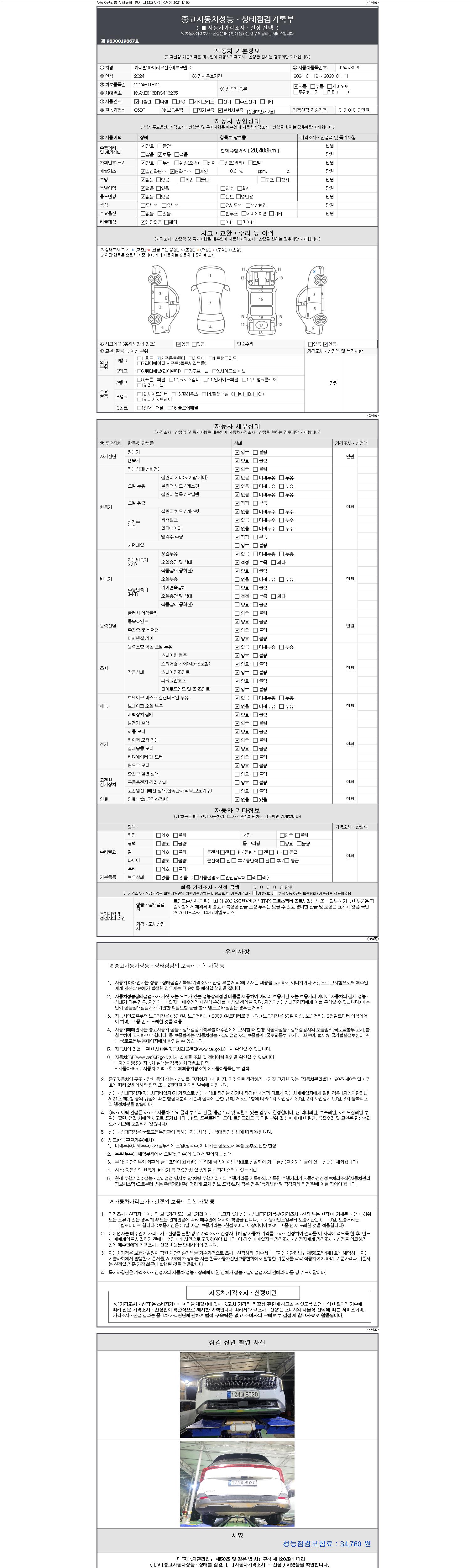 자동차관리법 시행규칙 제120조의 규정에 따라 별지 제 82호서식 《중고자동차 성능, 상태점검 기록부》를 발행한 성능, 상태점검자 및 매매자는 아래의 보증기간 또는 보증거리 이내의 중고자동차, 성능점검 기록부에 기재된 내용과 자동차의 실제 성능, 상태가 다른 경우 계약 또는 관계법령에 따라 매수인에 대하여 책임을 집니다.