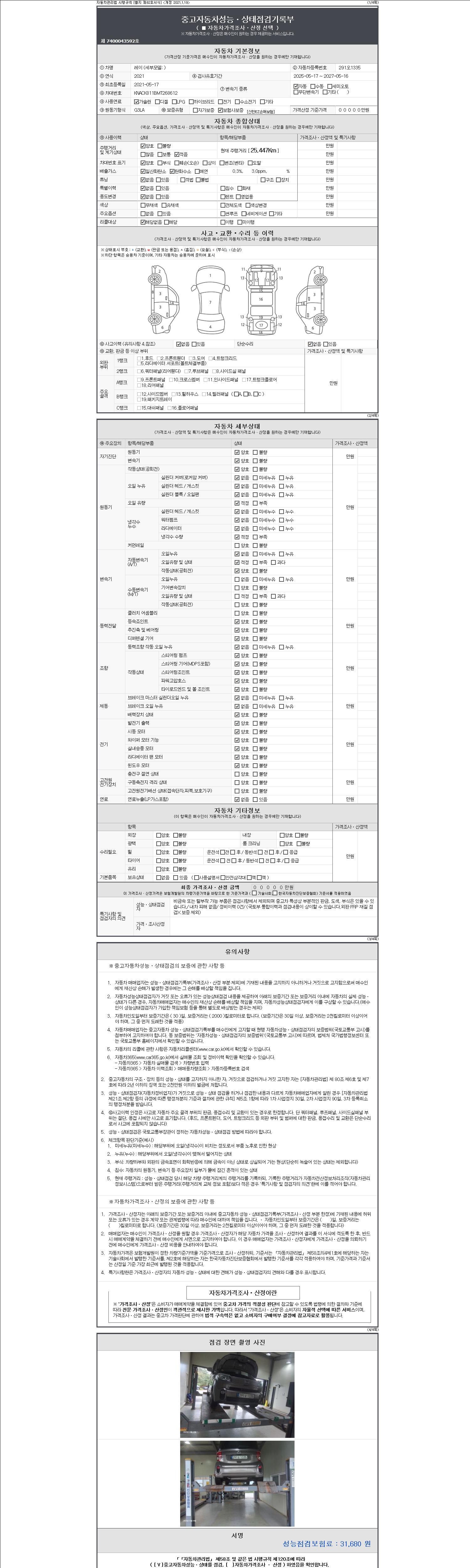 | 주행거리 | 25,447 km | 차량번호 | 291오1335 | 사고유무 | 성능기록부 참조 | 제시번호 | 제 2147483647 호 |