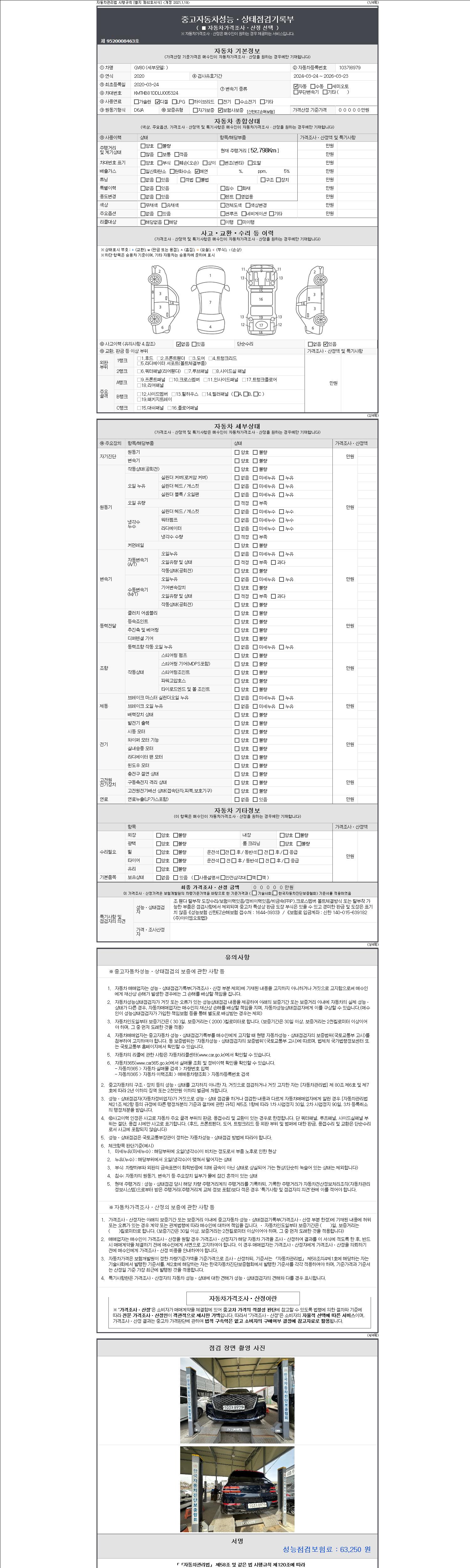 | 주행거리 | 52,798 km | 차량번호 | 103가8979 | 사고유무 | 성능기록부 참조 | 제시번호 | 제 2147483647 호 |