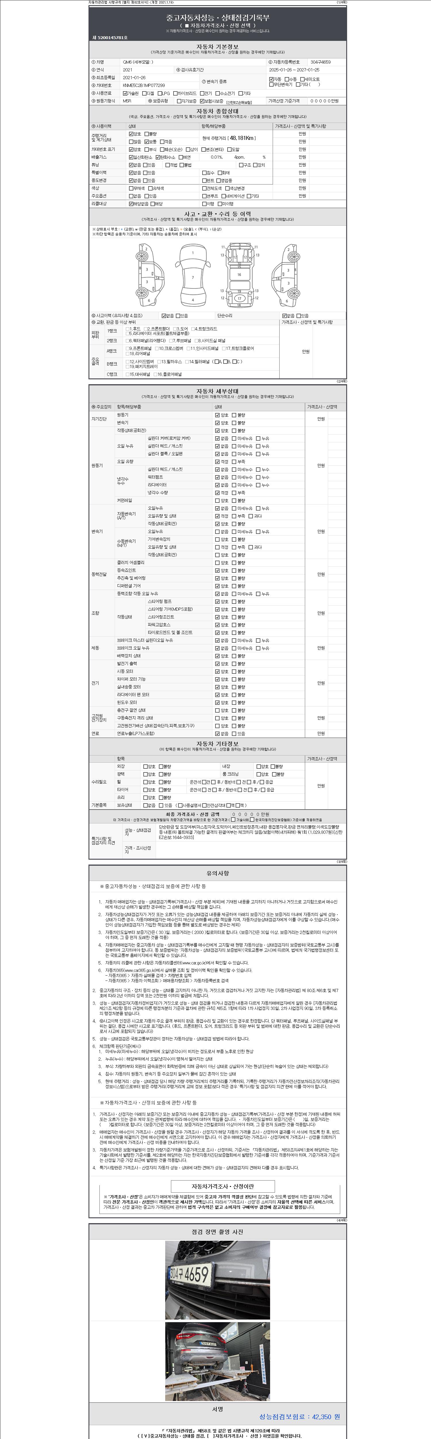 | 주행거리 | 48,181 km | 차량번호 | 304구4659 | 사고유무 | 성능기록부 참조 | 제시번호 | 제 2147483647 호 |