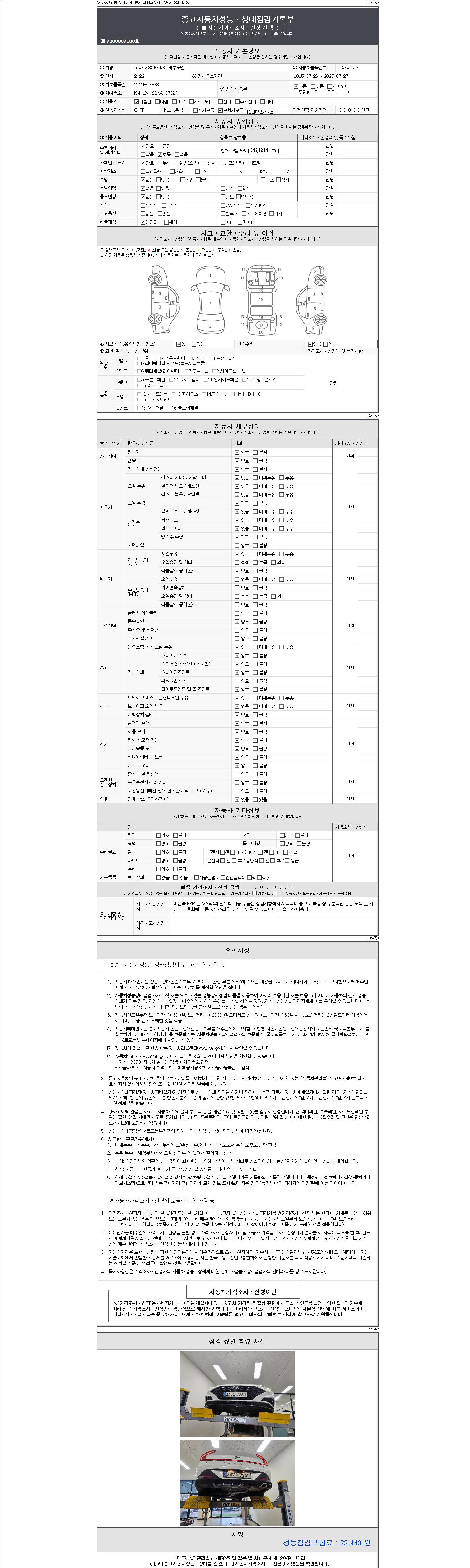 자동차관리법 시행규칙 제120조의 규정에 따라 별지 제 82호서식 《중고자동차 성능, 상태점검 기록부》를 발행한 성능, 상태점검자 및 매매자는 아래의 보증기간 또는 보증거리 이내의 중고자동차, 성능점검 기록부에 기재된 내용과 자동차의 실제 성능, 상태가 다른 경우 계약 또는 관계법령에 따라 매수인에 대하여 책임을 집니다.