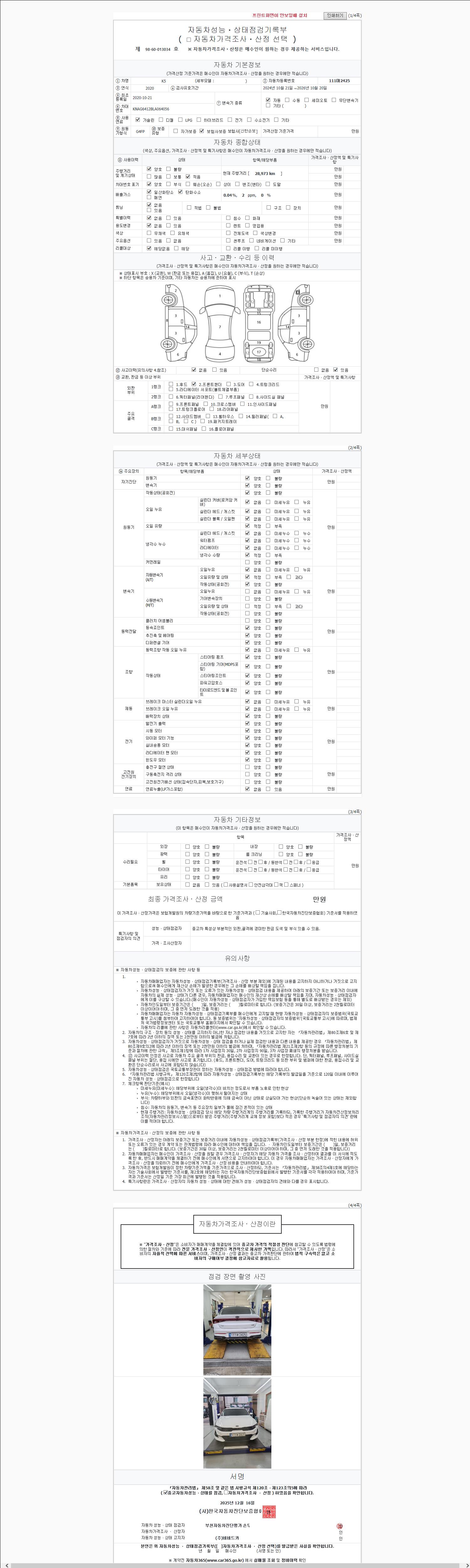 | 주행거리 | 28,973 km | 차량번호 | 111머2425 | 사고유무 | 성능기록부 참조 | 제시번호 | 제 2025231380 호 |