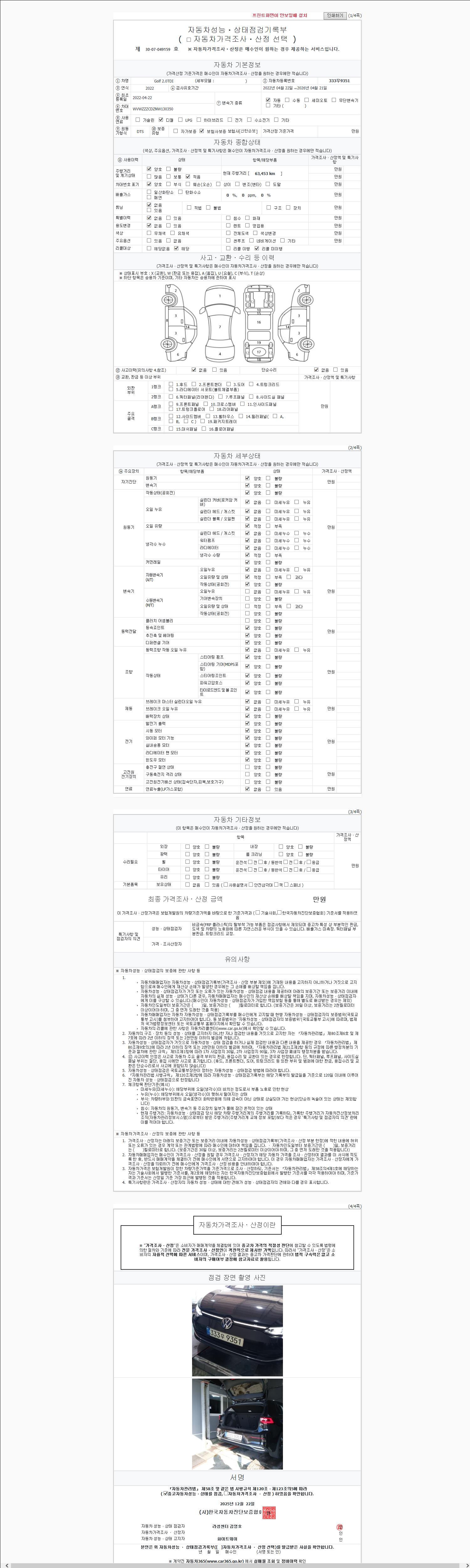 | 주행거리 | 63,406 km | 차량번호 | 333우9351 | 사고유무 | 성능기록부 참조 | 제시번호 | 제 2147483647 호 |