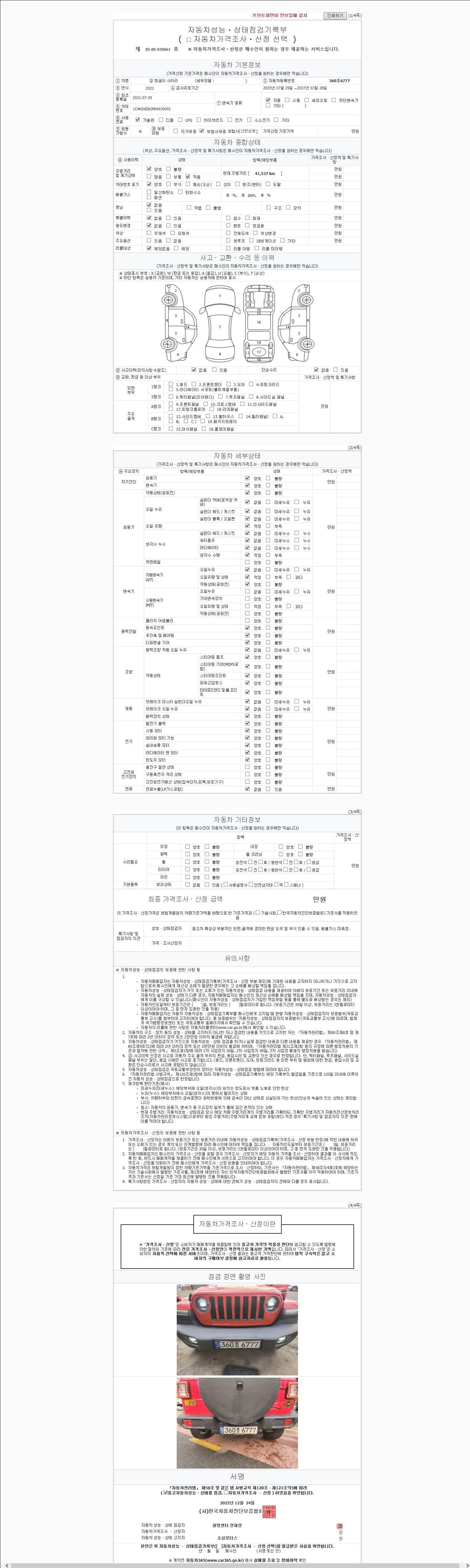 | 주행거리 | 41,537 km | 차량번호 | 360조6777 | 사고유무 | 성능기록부 참조 | 제시번호 | 제 2147483647 호 |