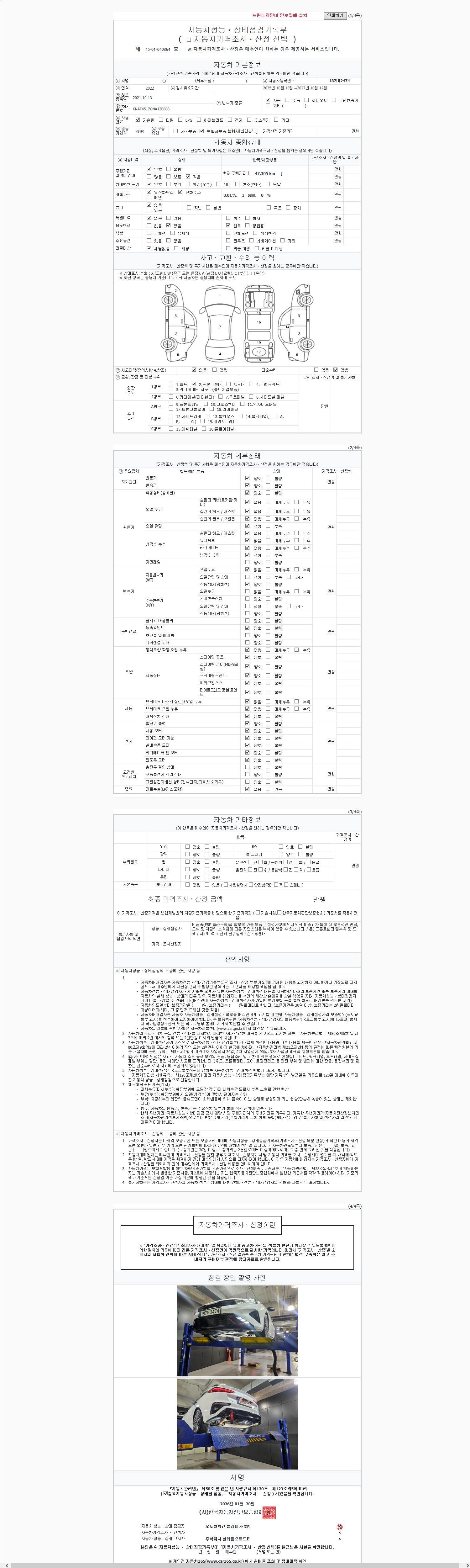 | 주행거리 | 47,305 km | 차량번호 | 187머2474 | 사고유무 | 성능기록부 참조 | 제시번호 | 제 2147483647 호 |