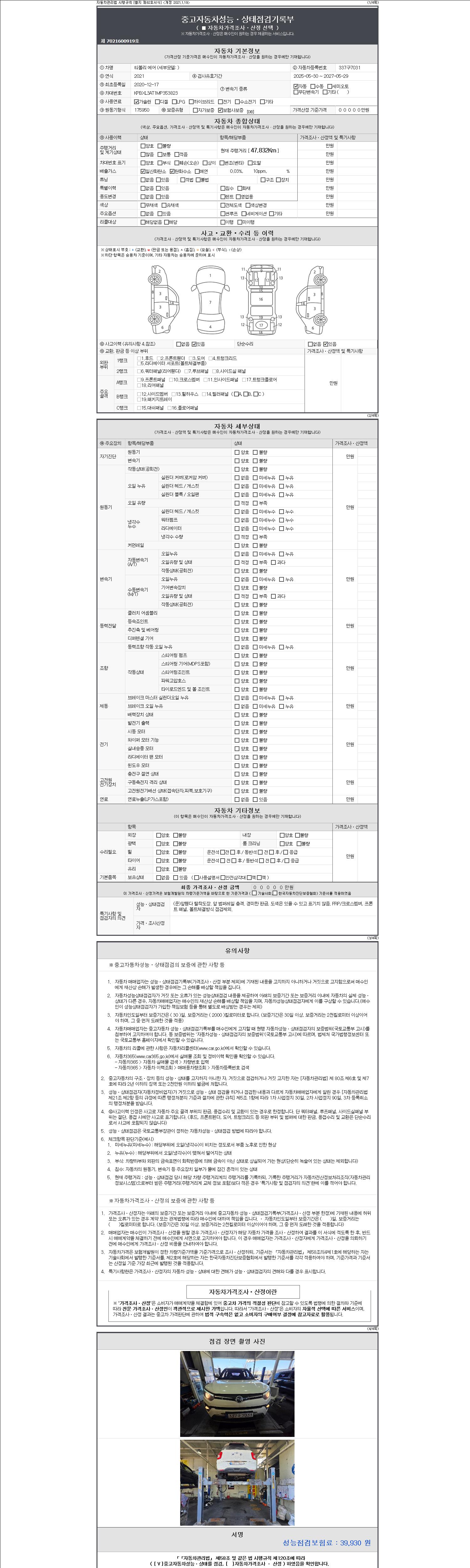 자동차관리법 시행규칙 제120조의 규정에 따라 별지 제 82호서식 《중고자동차 성능, 상태점검 기록부》를 발행한 성능, 상태점검자 및 매매자는 아래의 보증기간 또는 보증거리 이내의 중고자동차, 성능점검 기록부에 기재된 내용과 자동차의 실제 성능, 상태가 다른 경우 계약 또는 관계법령에 따라 매수인에 대하여 책임을 집니다.