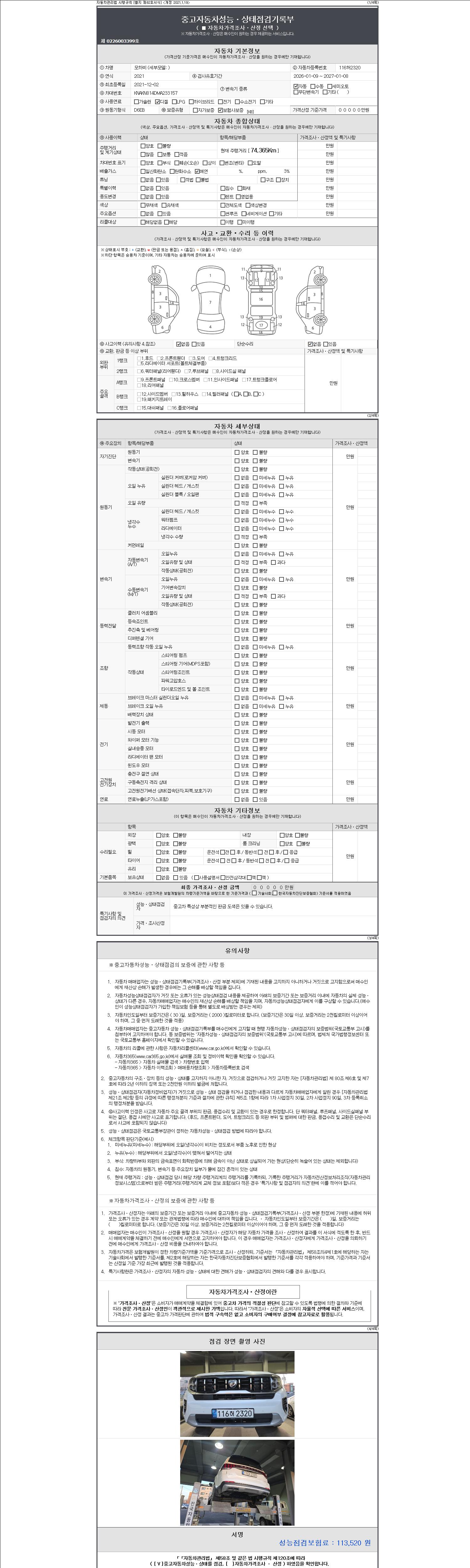 | 주행거리 | 74,365 km | 차량번호 | 116허2320 | 사고유무 | 성능기록부 참조 | 제시번호 | 제 2147483647 호 |