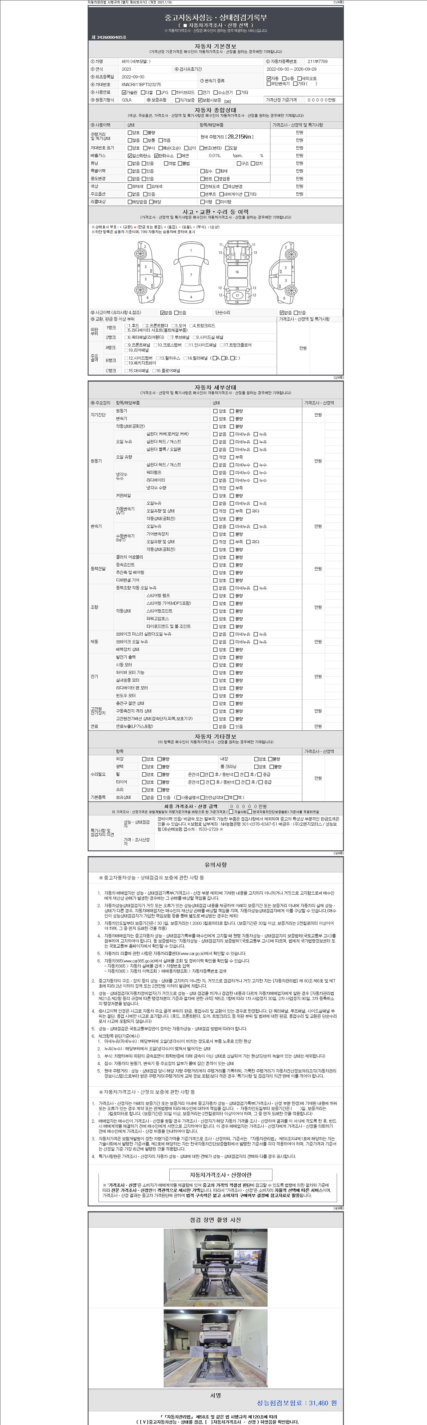 | 주행거리 | 28,215 km | 차량번호 | 211부7789 | 사고유무 | 성능기록부 참조 | 제시번호 | 제 2147483647 호 |