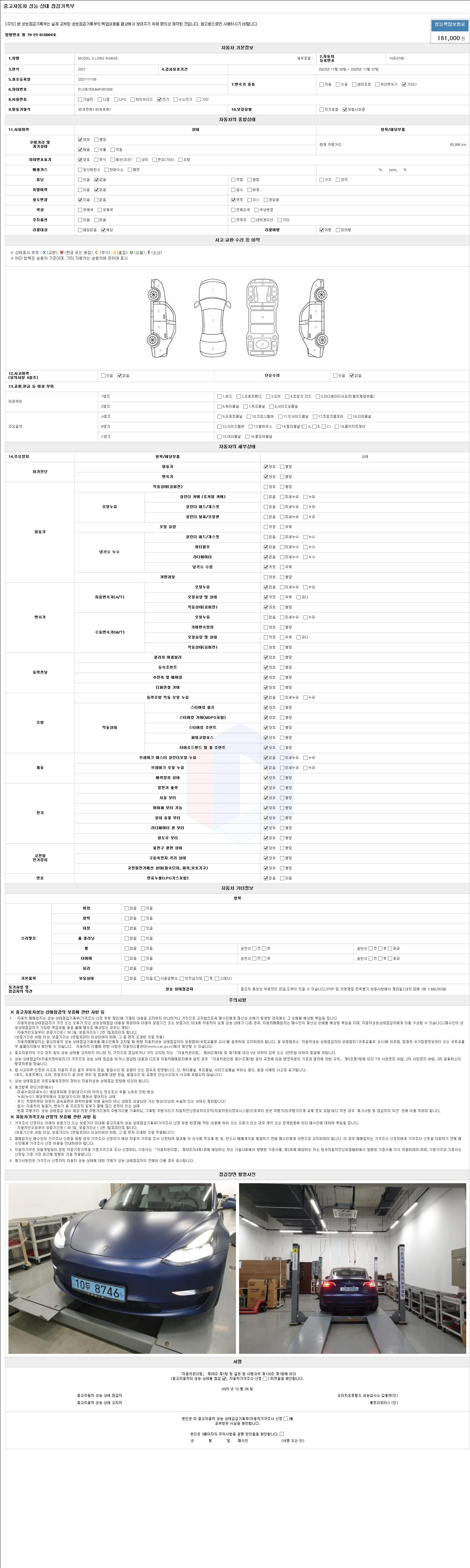 자동차관리법 시행규칙 제120조의 규정에 따라 별지 제 82호서식 《중고자동차 성능, 상태점검 기록부》를 발행한 성능, 상태점검자 및 매매자는 아래의 보증기간 또는 보증거리 이내의 중고자동차, 성능점검 기록부에 기재된 내용과 자동차의 실제 성능, 상태가 다른 경우 계약 또는 관계법령에 따라 매수인에 대하여 책임을 집니다.