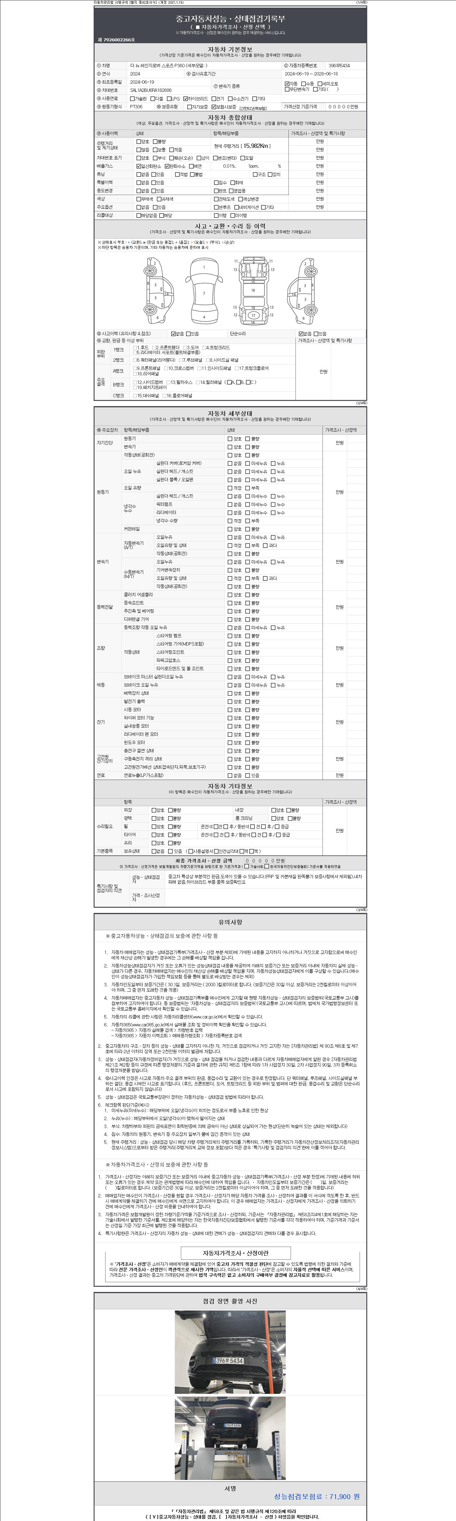 | 주행거리 | 15,982 km | 차량번호 | 396무5434 | 사고유무 | 성능기록부 참조 | 제시번호 | 제 2147483647 호 |