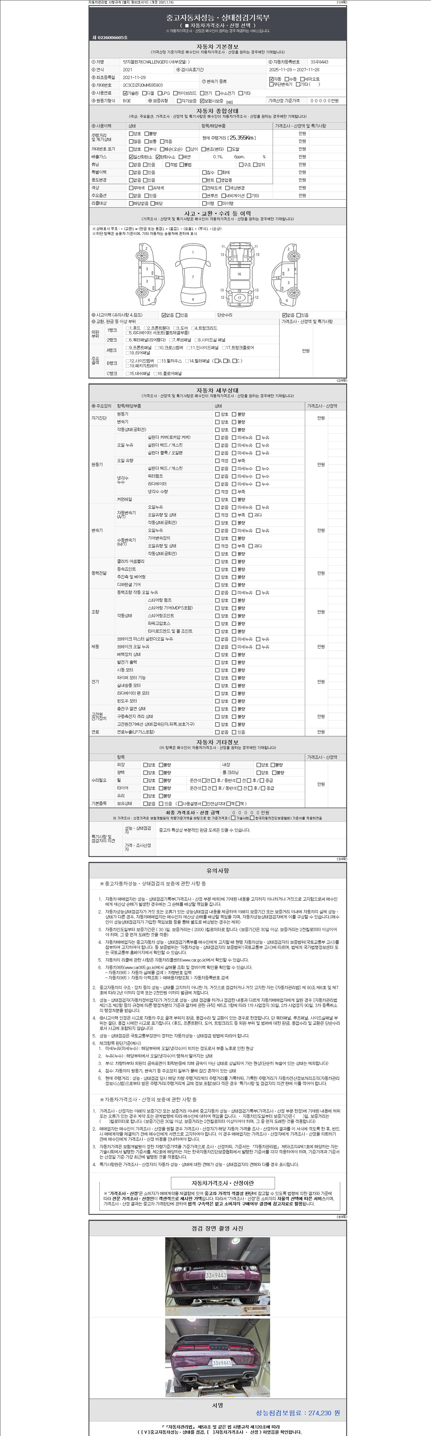 | 주행거리 | 25,355 km | 차량번호 | 33우9443 | 사고유무 | 성능기록부 참조 | 제시번호 | 제 2147483647 호 |