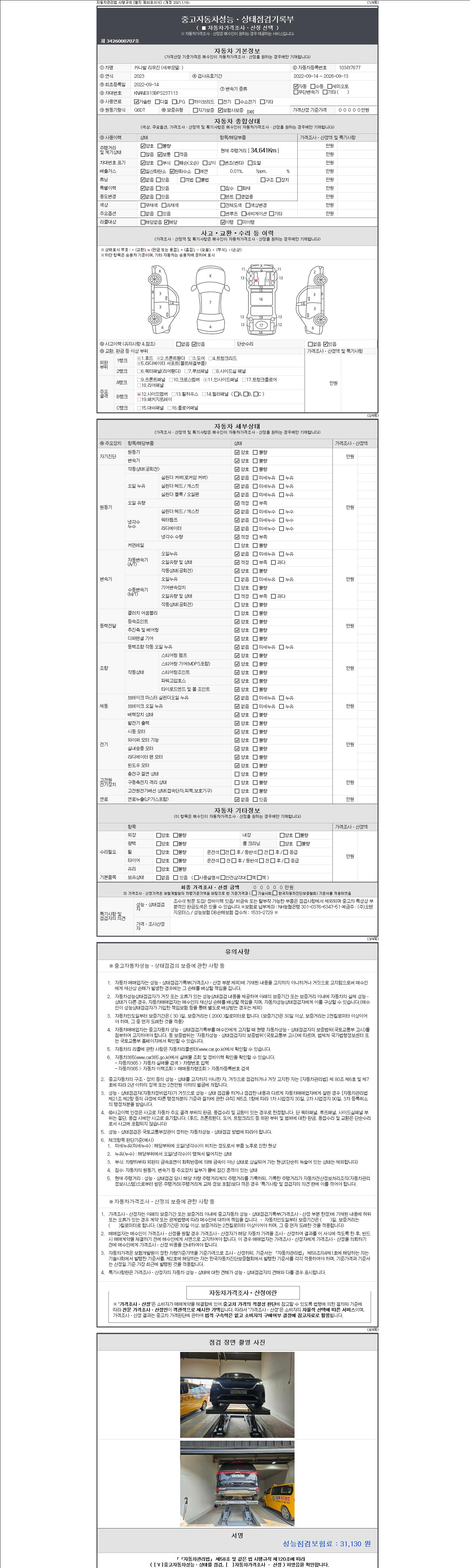 | 주행거리 | 31,464 km | 차량번호 | 103러7677 | 사고유무 | 성능기록부 참조 | 제시번호 | 제 2147483647 호 |