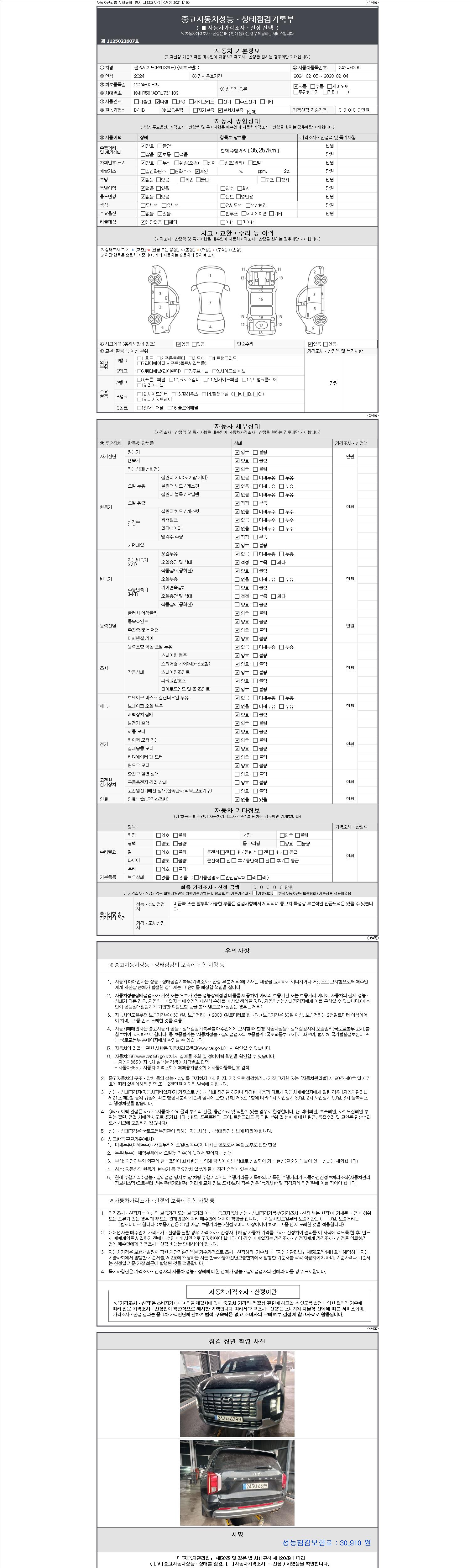 자동차관리법 시행규칙 제120조의 규정에 따라 별지 제 82호서식 《중고자동차 성능, 상태점검 기록부》를 발행한 성능, 상태점검자 및 매매자는 아래의 보증기간 또는 보증거리 이내의 중고자동차, 성능점검 기록부에 기재된 내용과 자동차의 실제 성능, 상태가 다른 경우 계약 또는 관계법령에 따라 매수인에 대하여 책임을 집니다.