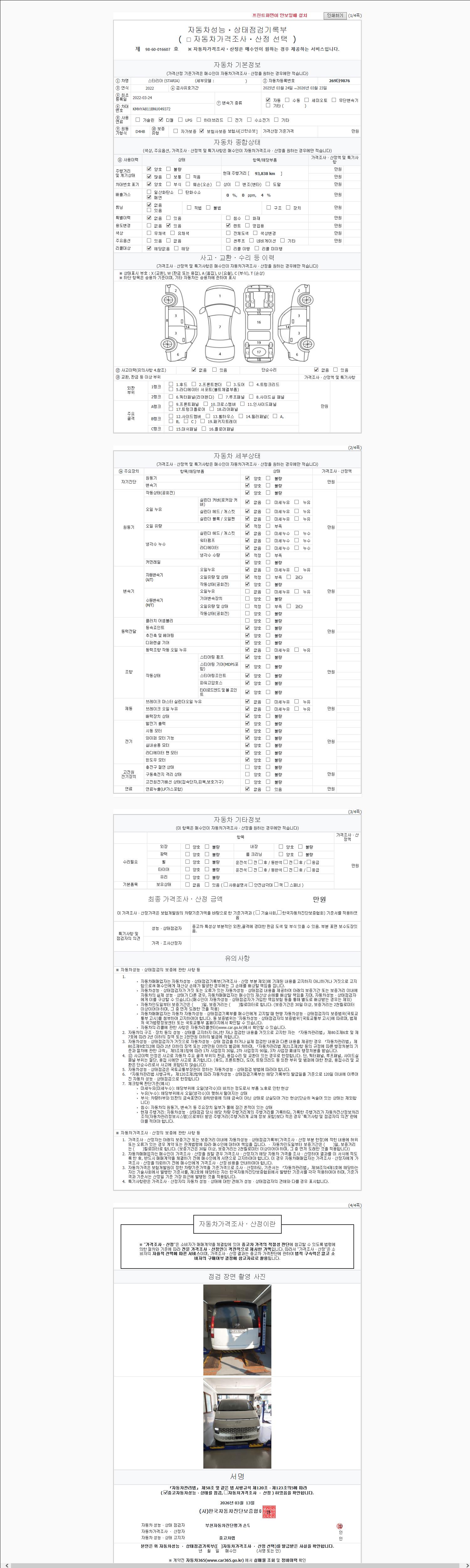 | 주행거리 | 93,838 km | 차량번호 | 269더9876 | 사고유무 | 성능기록부 참조 | 제시번호 | 제 2026047303 호 |