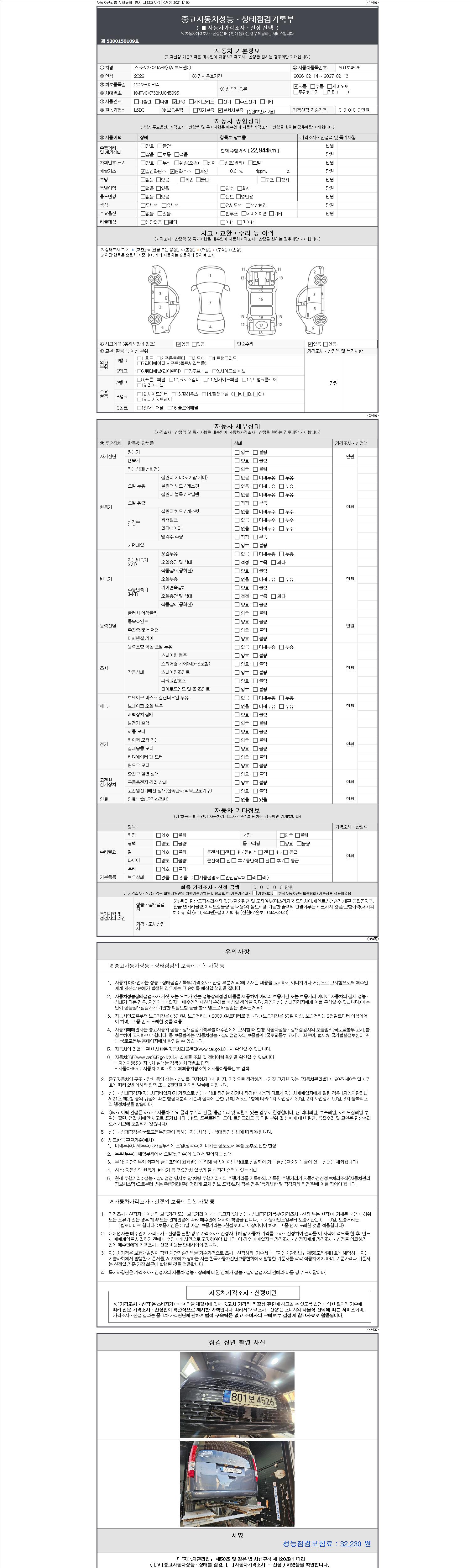자동차관리법 시행규칙 제120조의 규정에 따라 별지 제 82호서식 《중고자동차 성능, 상태점검 기록부》를 발행한 성능, 상태점검자 및 매매자는 아래의 보증기간 또는 보증거리 이내의 중고자동차, 성능점검 기록부에 기재된 내용과 자동차의 실제 성능, 상태가 다른 경우 계약 또는 관계법령에 따라 매수인에 대하여 책임을 집니다.